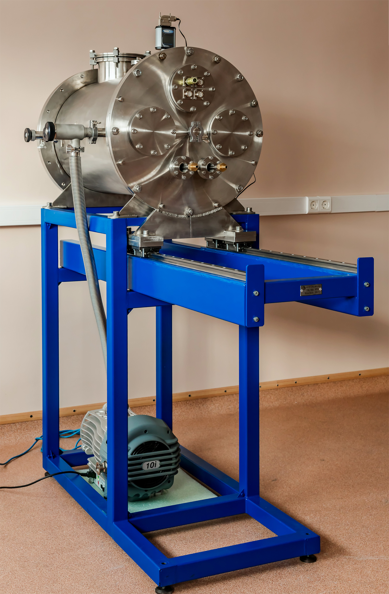 Вакуумная камера ТВС-400 оборудована фланцами для присоединения электрических вводов, газовых вводов и иного дополнительного оборудования. В камере предусмотрен фланец ISO-K160, предназначенный для монтажа высоковакуумного турбомолекулярного насоса. Установка турбомолекулярного насоса значительно расширит диапазон рабочих давлений и позволит проводить испытания приборов, размещаемых на внеатмосферных орбитальных спутниках и лунной поверхности.