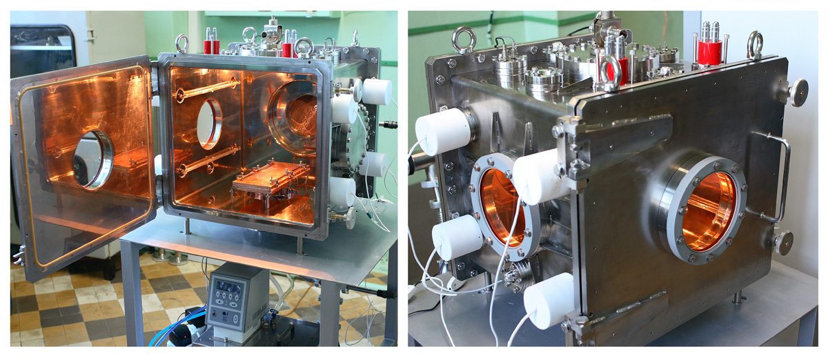 По требованию Заказчика габариты вакуумной камеры и типоразмеры присоединительных фланцев могут быть изменены. Камера может иметь цилиндрическую форму с горизонтальным расположением. Установка может комплектоваться криопанелью и системой сверхвысоковакуумной откачки на основе магниторазрядного насоса.